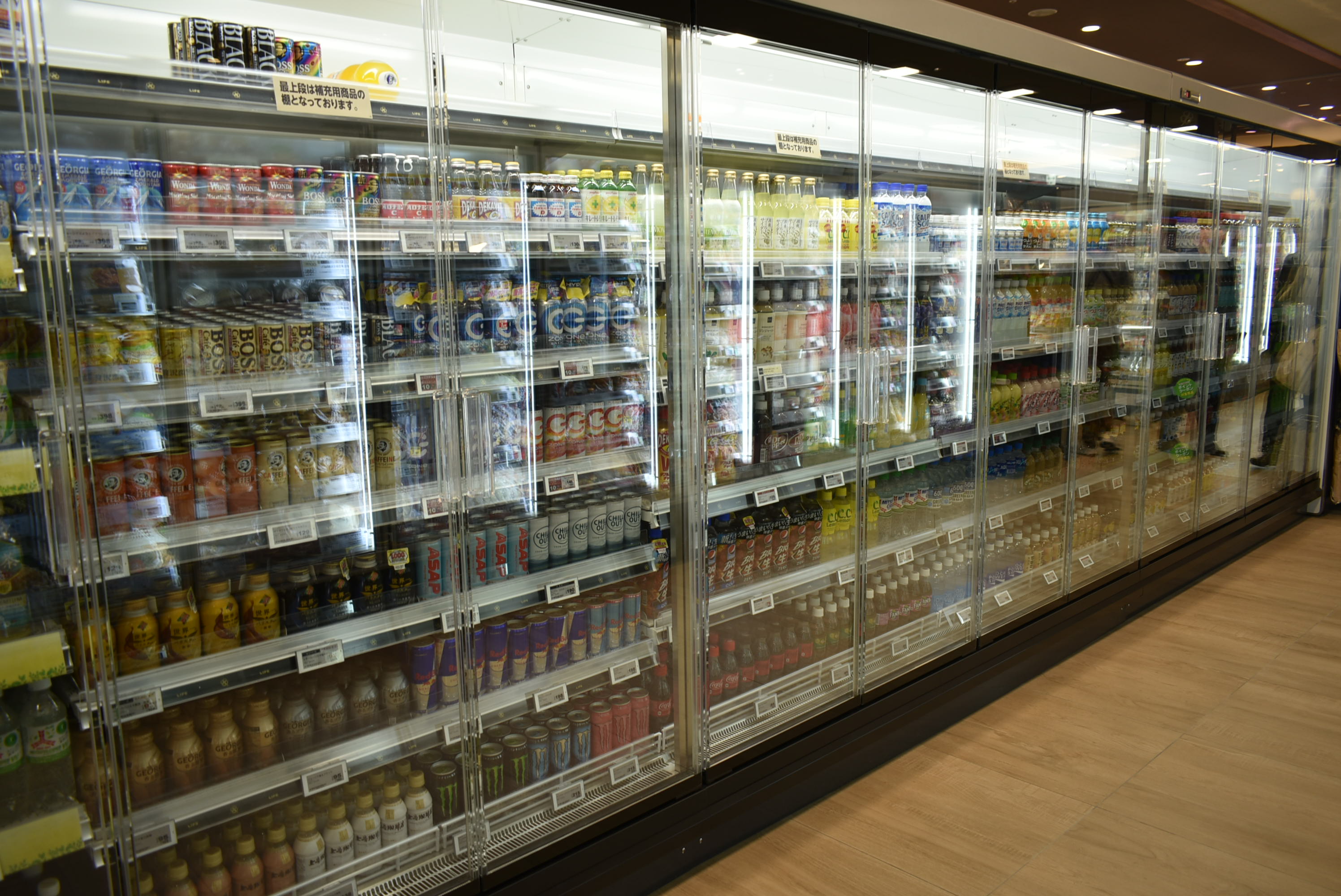扉付きの冷ケースにすることで冷気が逃げ出すことを防止しています。